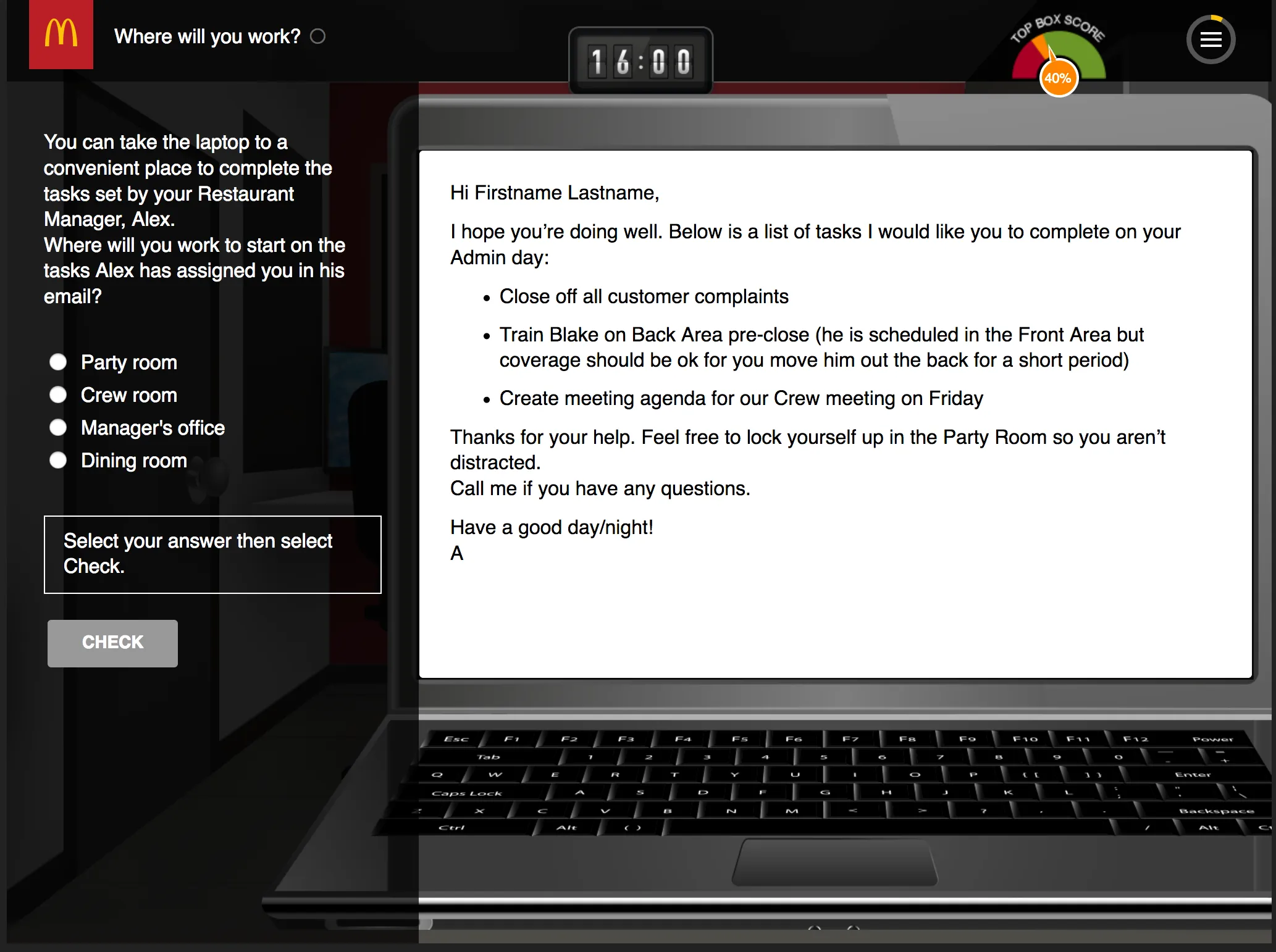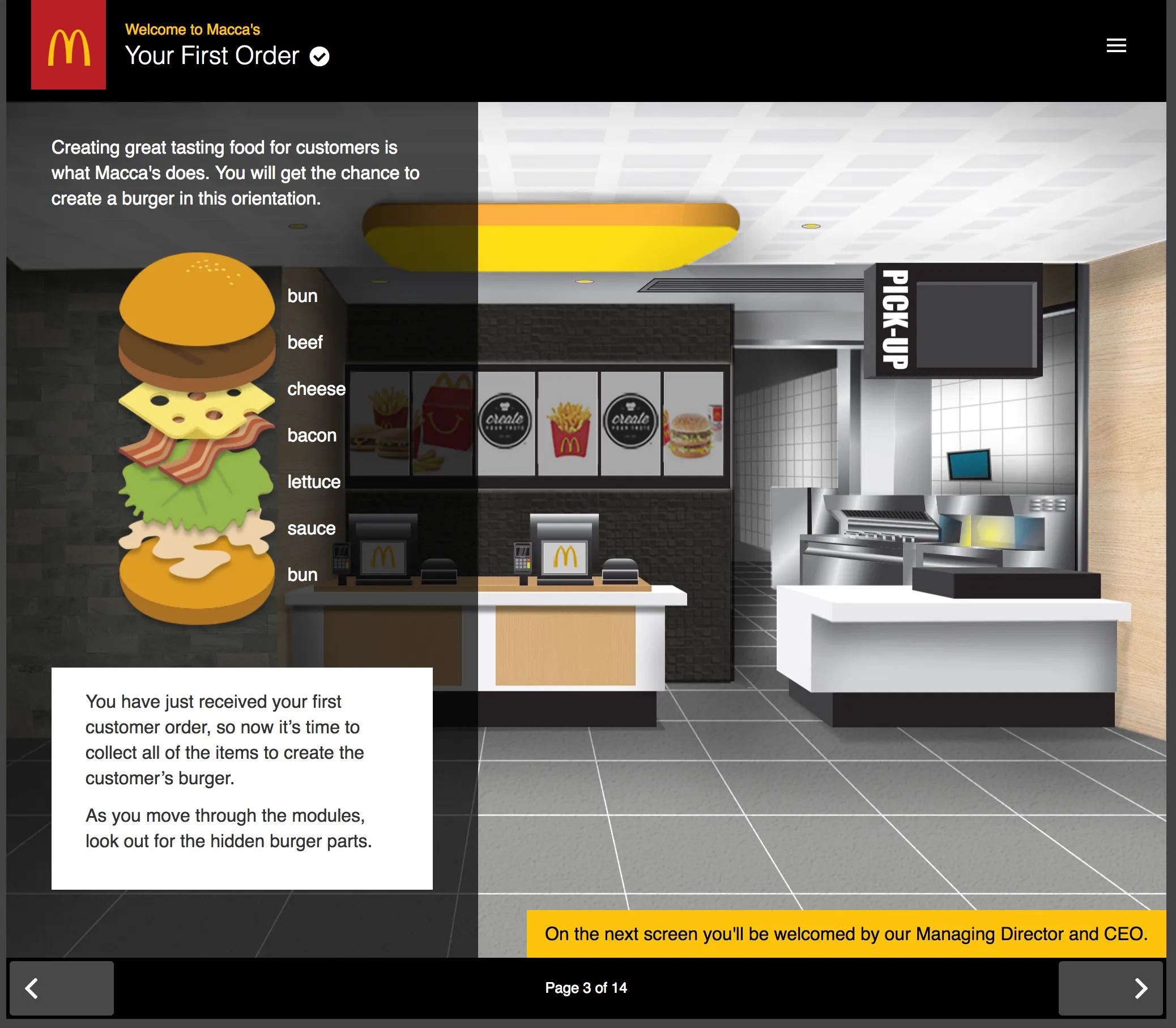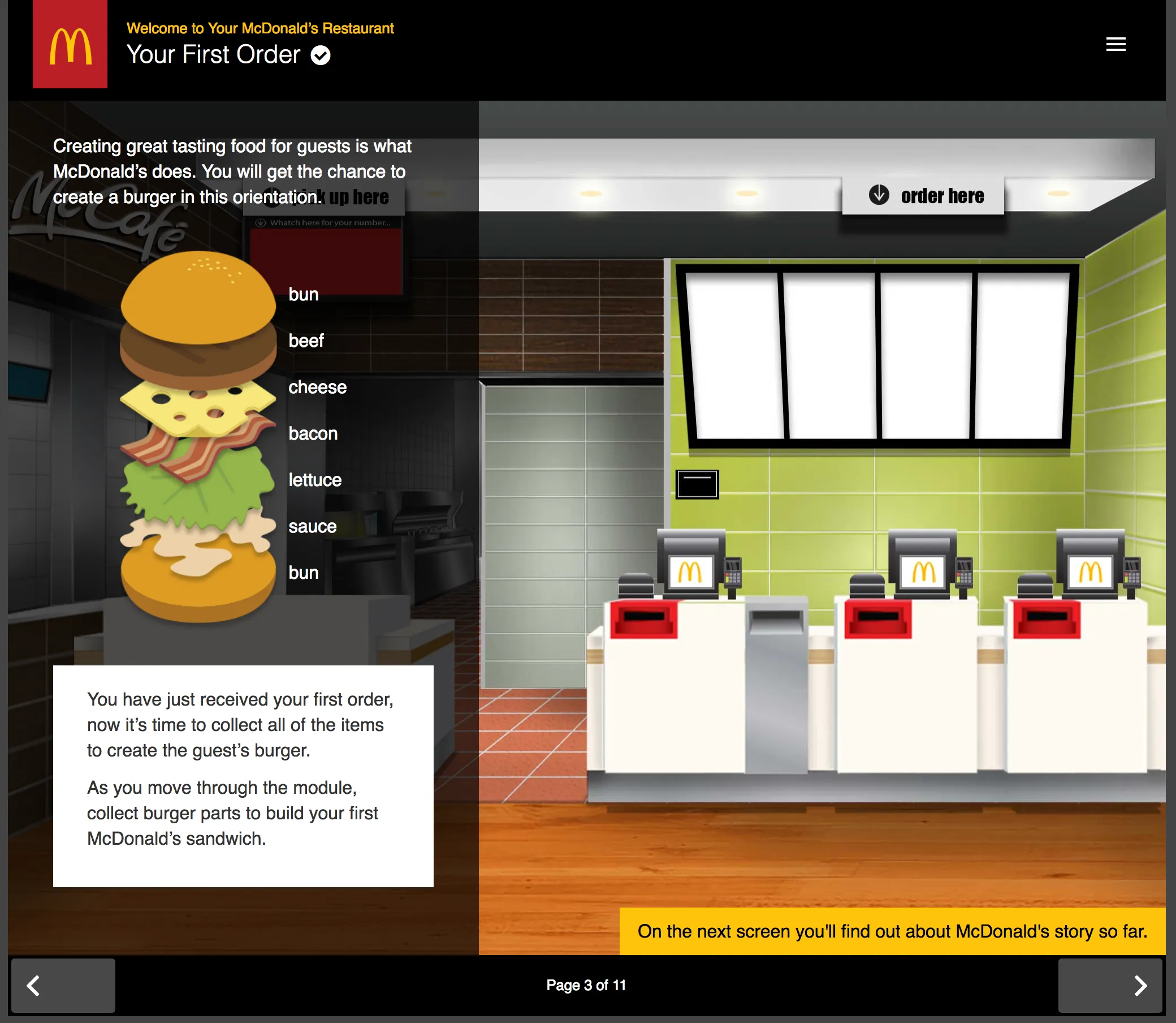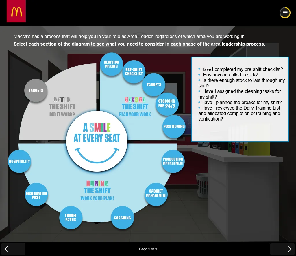 Built in close alignment with McDonald’s global brand standards and instructional storyboards, the final result was a practical, engaging onboarding experience that made complex workflows easier to understand, reinforced consistency across regions, and supported smoother transitions from training to real-world execution.