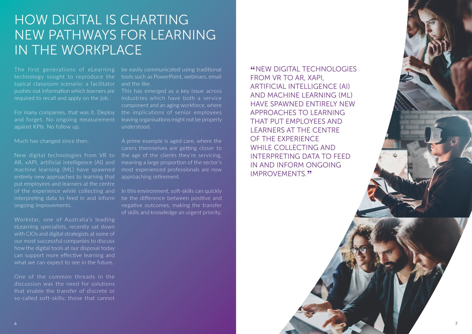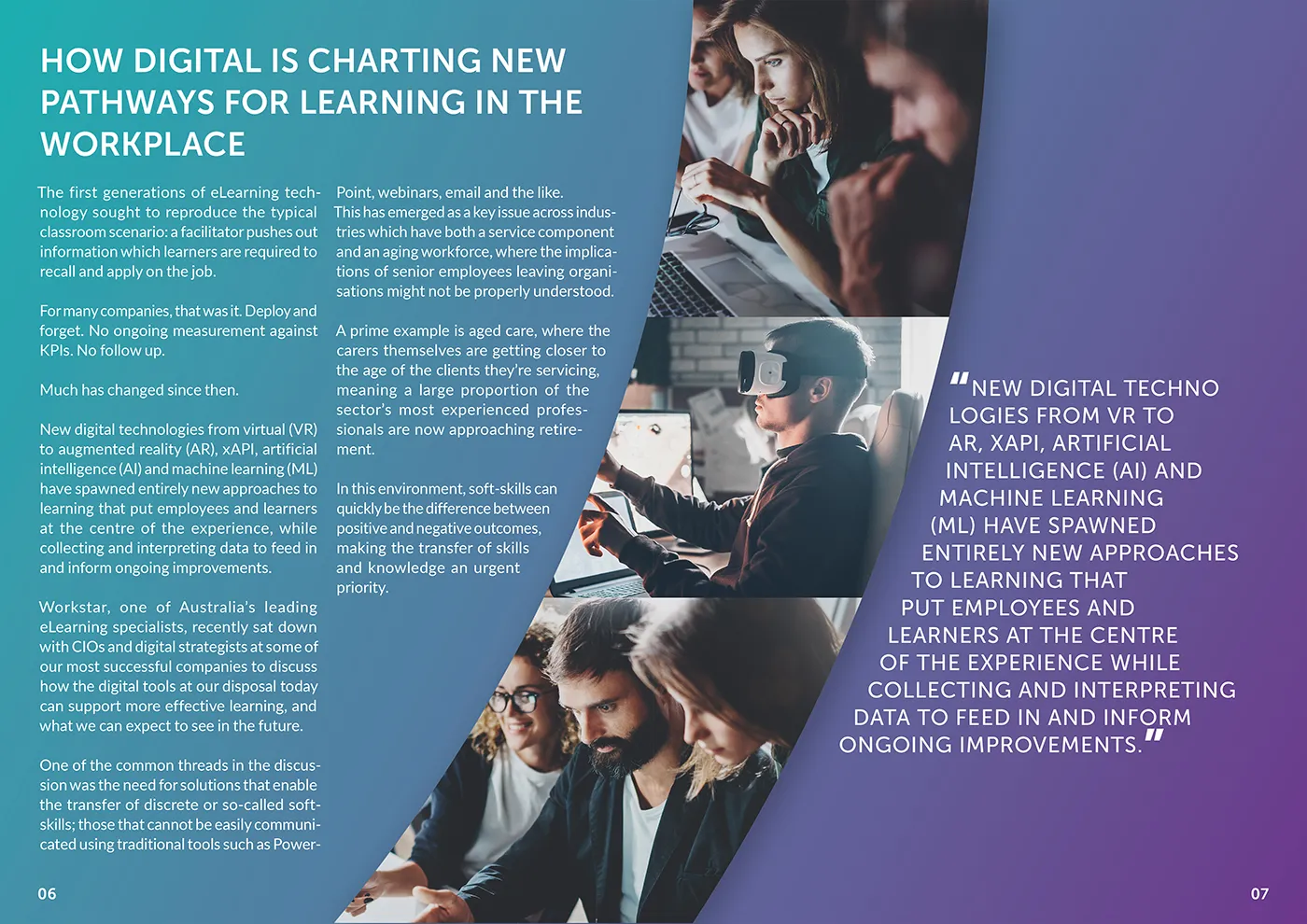 Designed layouts and spreads for the May 2018 edition of Workstar’s magazine/eBook, featuring the article “How Digital is Charting New Pathways for Learning in the Workplace.” Emphasized clean editorial design and readability across digital platforms.