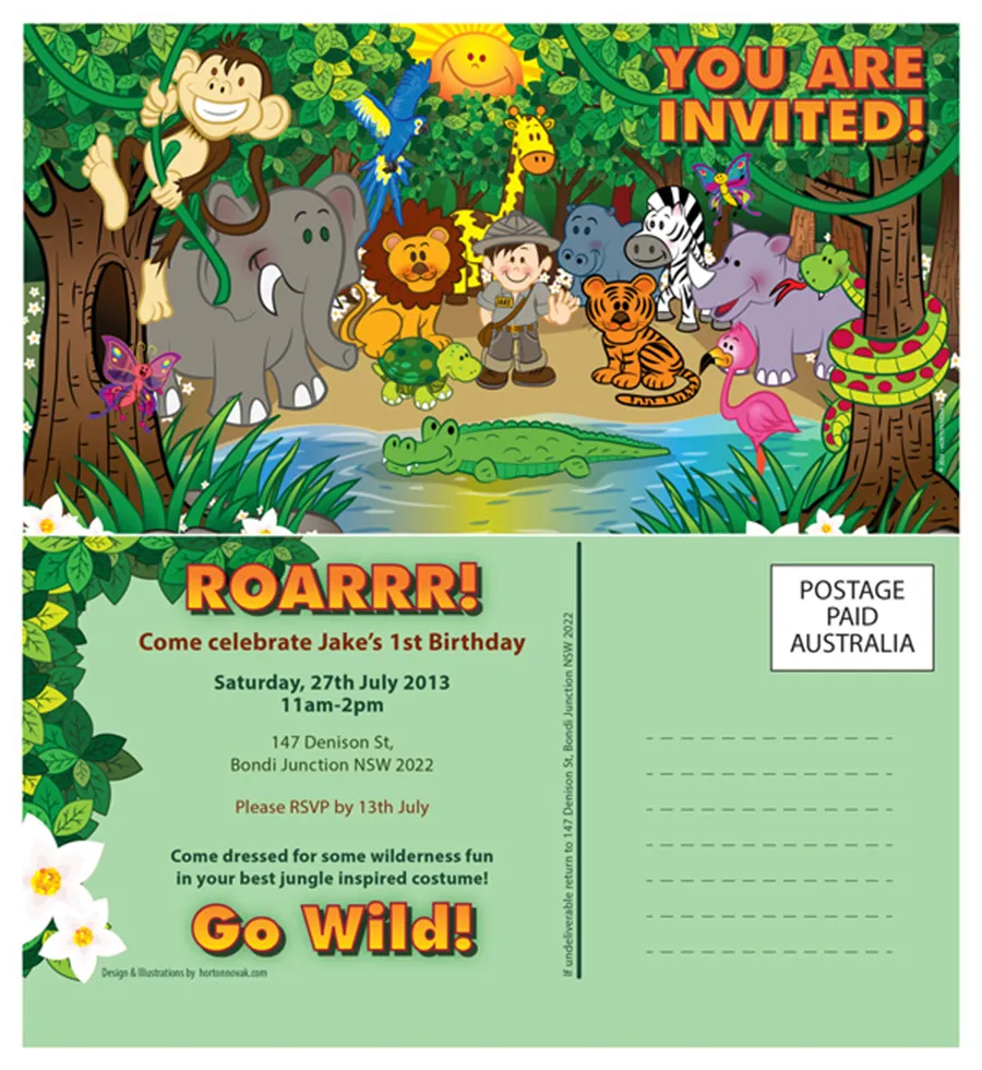 In this project, I designed a playful, double-sided postcard invitation for a birthday party themed with forest animals. The layout combined fun, bold visuals with a clear, easy-to-read format, making it both festive and practical for guests to RSVP. The illustrations were also used in goodie bags, decorations, and on a 5-meter poster background.