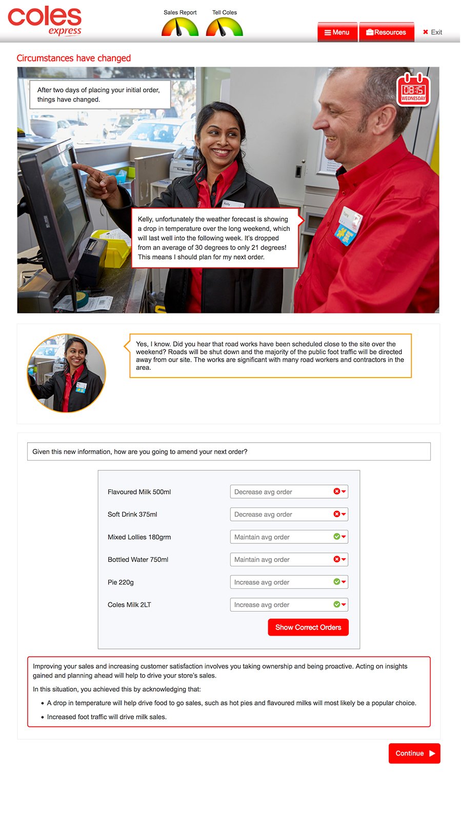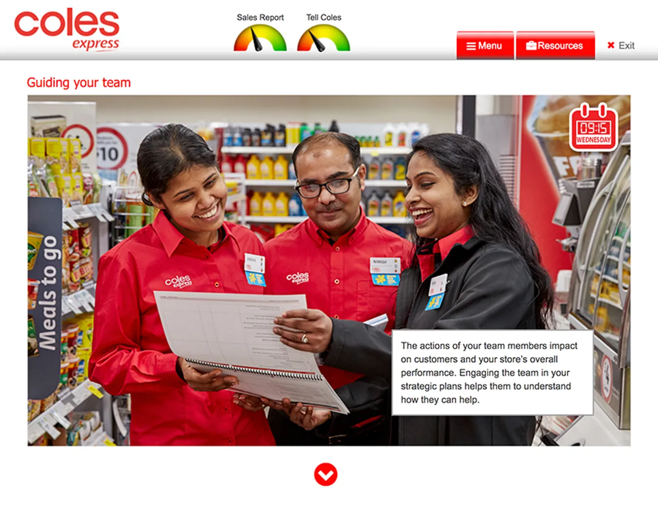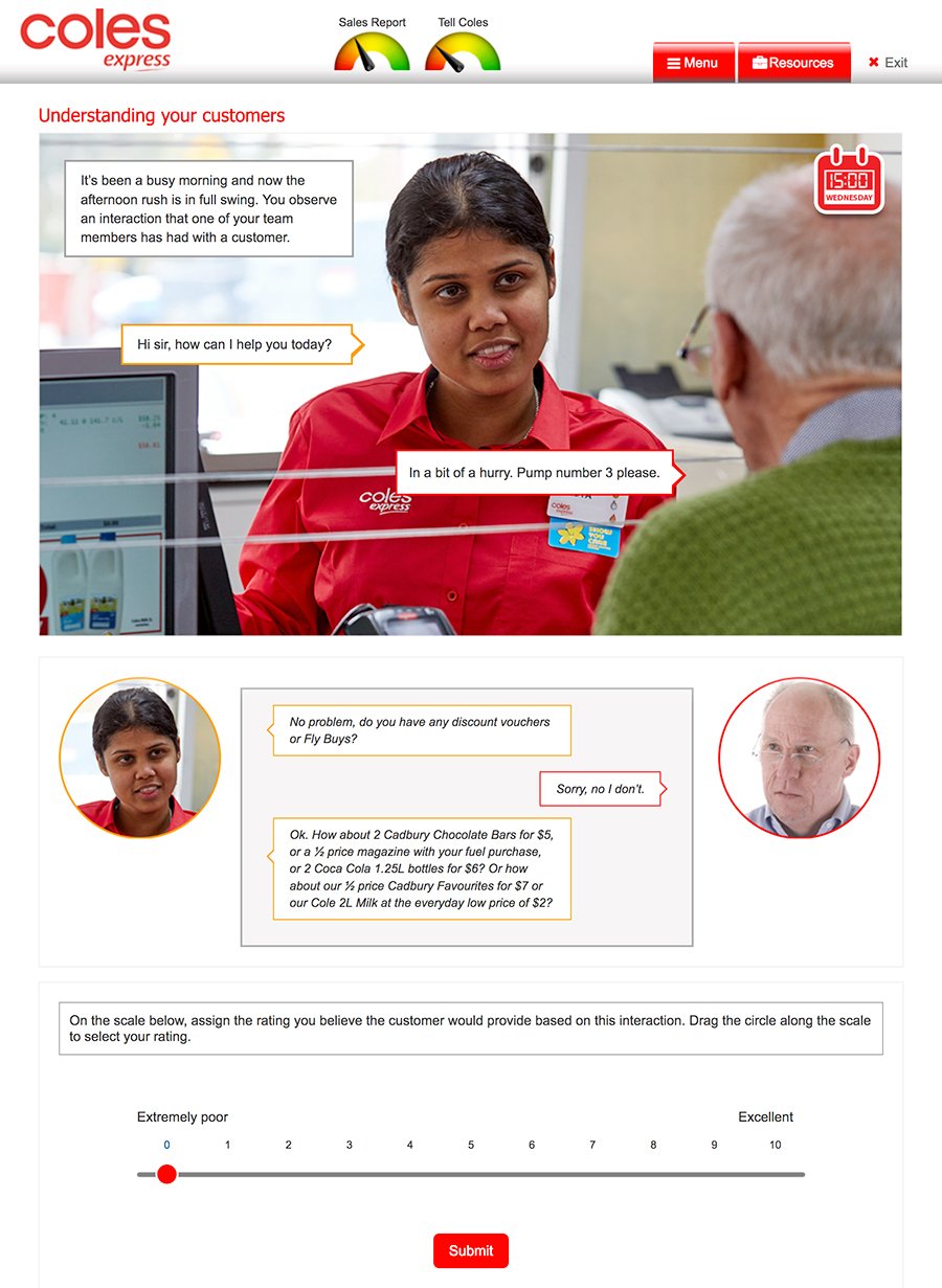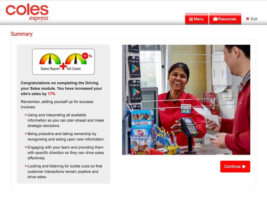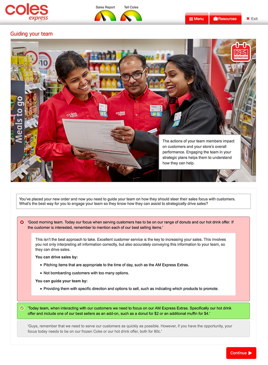 As part of Coles Express’ employee induction program, I developed an interactive training module called Guiding Your Team. The module focused on delivering a clear, engaging learning experience that helped new employees quickly grasp leadership principles within the company. The project combined clean visuals with user-friendly interaction to keep the training both practical and motivating.